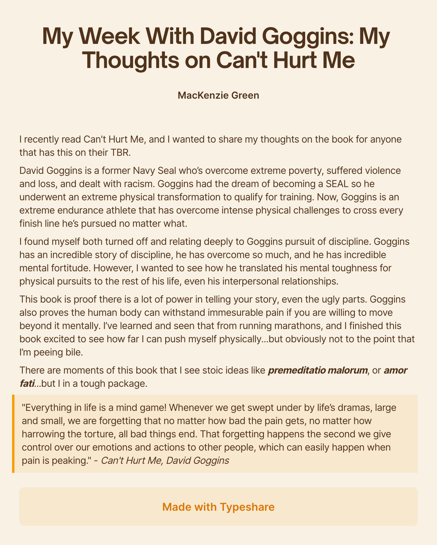 I have a lot of feelings about Goggins, but I would only recommend this book if you have a goal and healthy coping mechanisms…then I think you’re responsible enough to read this book.